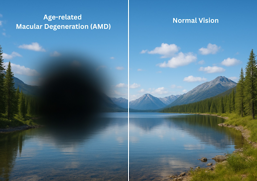 Age-related macular degeneration (AMD) is a chronic and painless disease of the macula that can blur your central vision. The macula is part of the retina, which is the light-sensitive tissue at the back of the eye that mainly controls sharp, detailed vision. AMD is a common condition that causes visual loss in those over 50. As we age, the macula can undergo damage, thinning, or abnormal blood vessel growth, leading to vision loss.