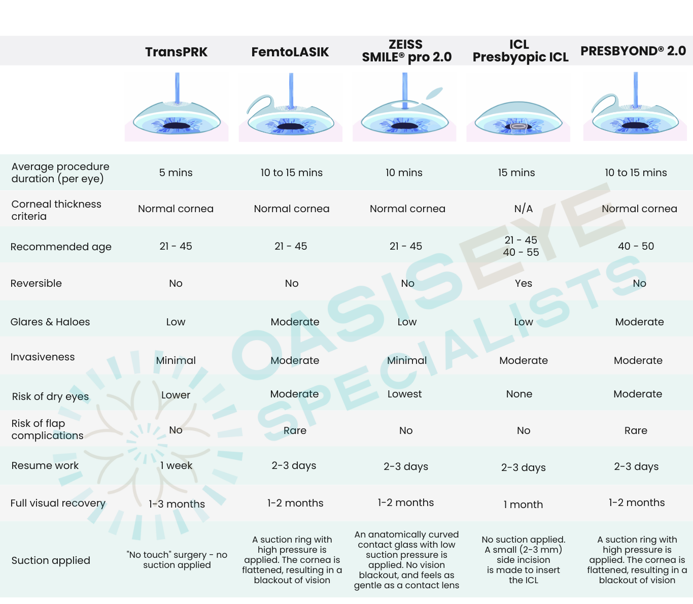 Refractive Vision Correction Comparison Some treatments are available at selected branches only. This table is for reference purposes only. Please consult a qualified ophthalmologist for personalized medical advice. Read Our Brochure Download (EN)